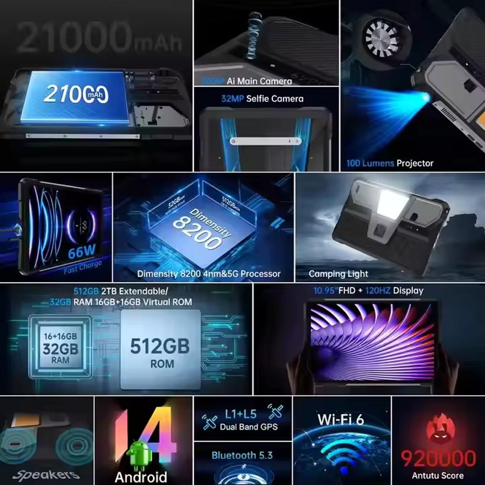 The dual stereo speakers provide powerful and clear sound, complemented by an integrated camping lamp, ideal for outdoor use. The tablet also has a 3.5 mm audio jack and USB Type-C 2.0, ensuring broad compatibility with various accessories.